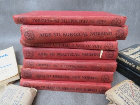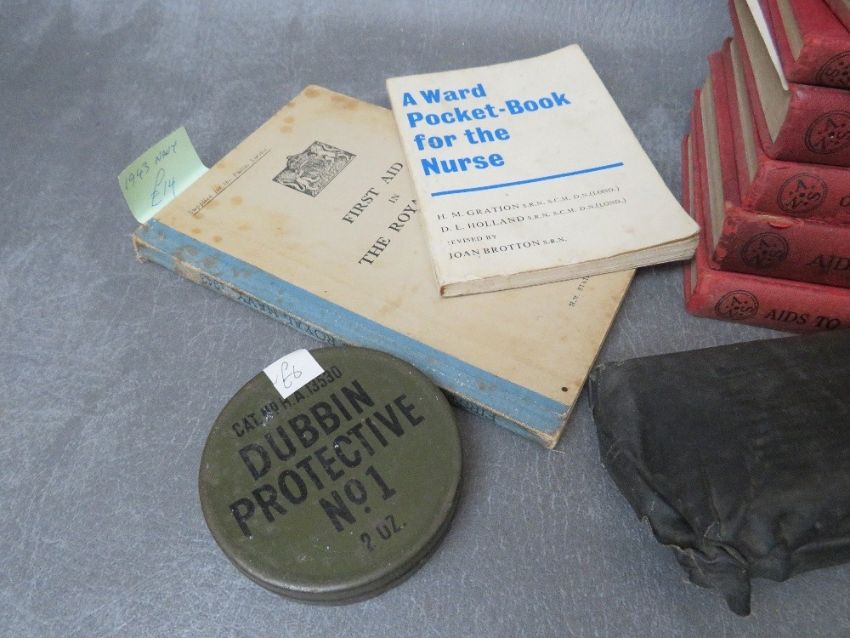 A COLLECTION OF FILED AND OTHER DRESSINGS, including an ARP 1938 dated shell dressing, an instructional sling and various medical related books