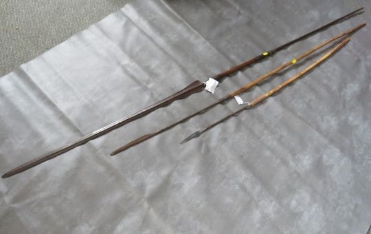 A MASAI LION HUNTING SPEAR, with long iron tips and central wooden grip, along with two smaller African spears (3)