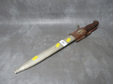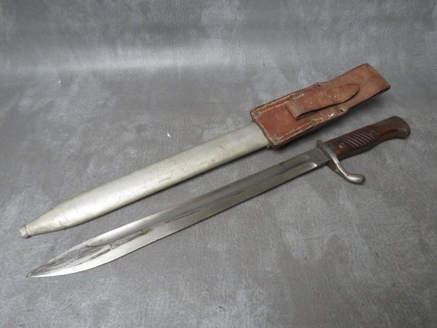 A WWI GERMAN IMPERIAL BUTCHER BAYONET, makers mark of Simson & Co. SUHL, spine of blade has date mark for 1915, in steel scabbard, with leather frog