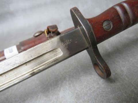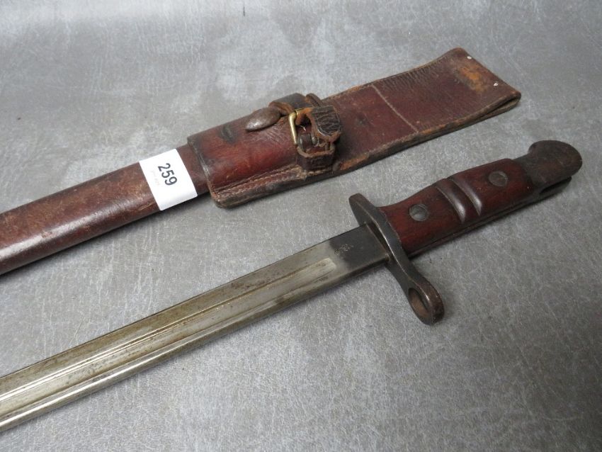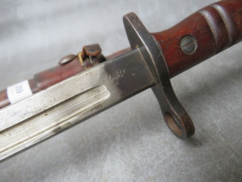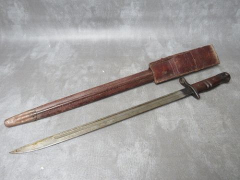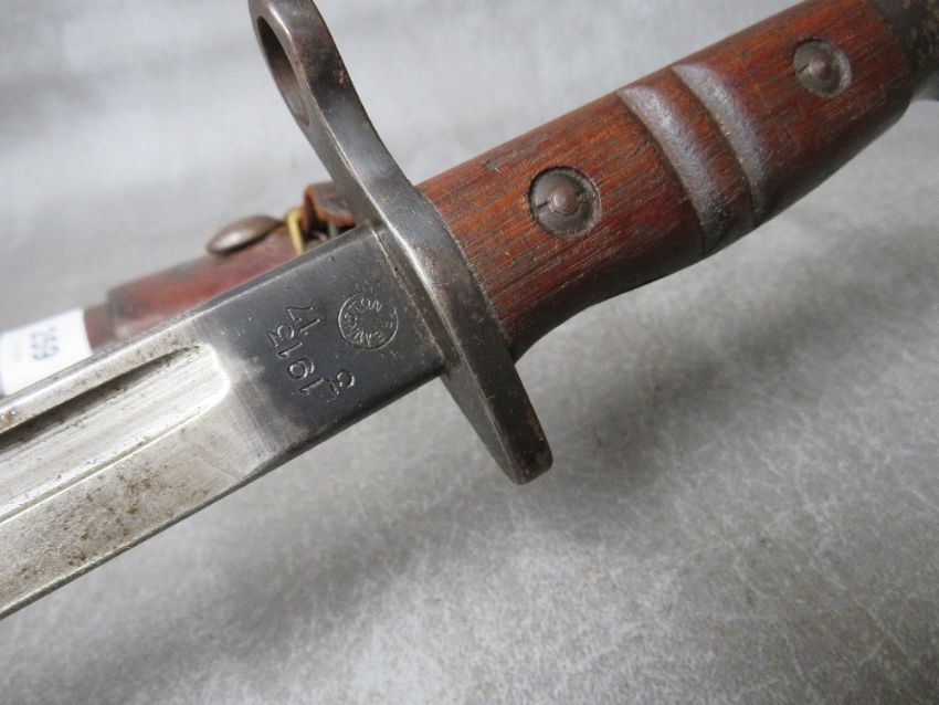 A REMINGTON 1913 BAYONET, with issue mark 3 17, with wooden grooved grip, in scabbard with leather frog