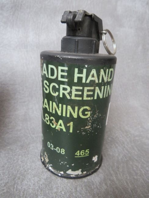 A US OFFENSIVE GRENADE, dated 1974, in original box, along with a training smoke screen grenade, both inert (2)