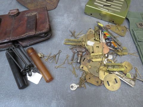 A SMALL BOX OF MILITARY COLLECTABLES, to include cycle lamps, Swedish mag case, various pouches etc.