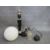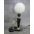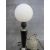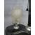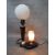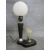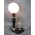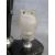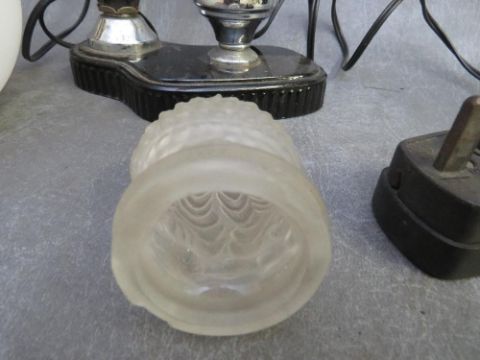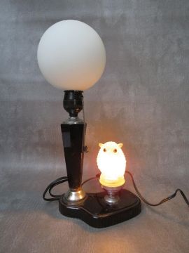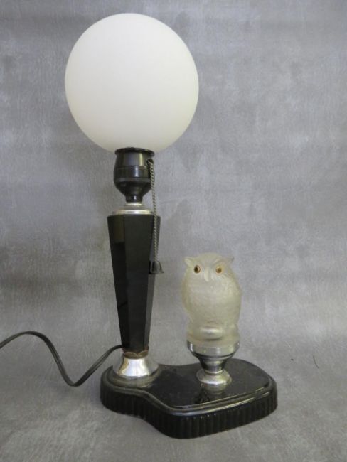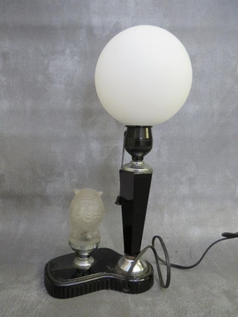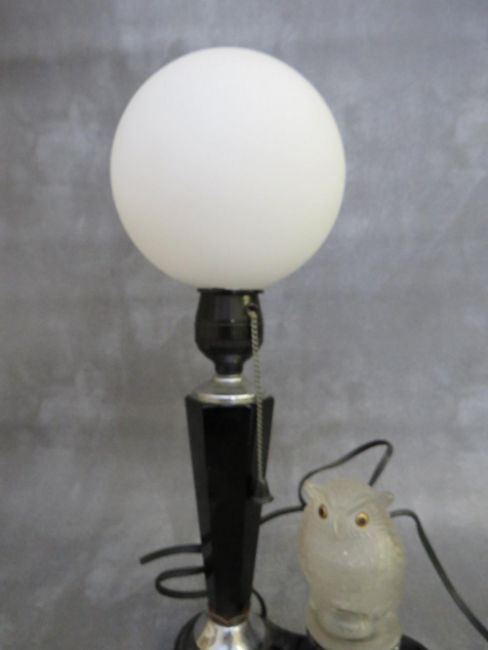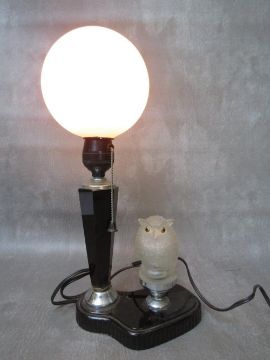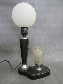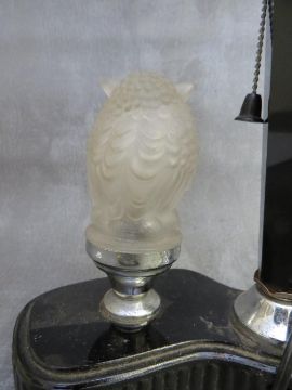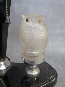 AN ART DECO BAKELITE TABLE LAMP WITH GLASS OWL CAR MASCOT, the glass owl car mascot illuminating alongside a hexagonal stemmed lamp with chrome collars and a white frosted glass shade, the pull switch illuminates either the mascot or the shade, overall H 34 cm