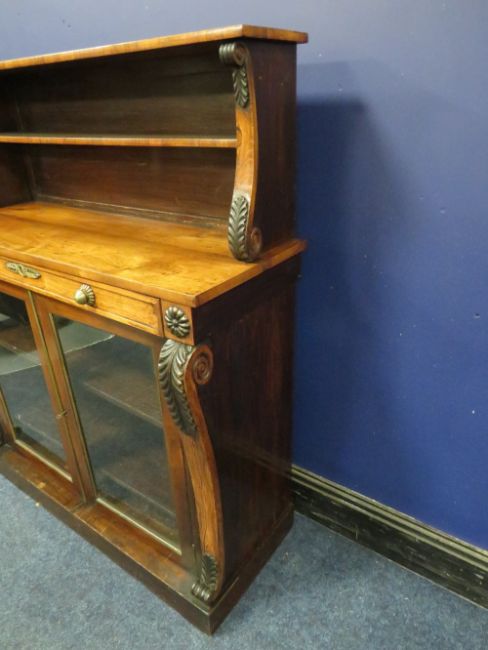 A 19TH CENTURY MAHOGANY CHIFFONIER OF SMALL PROPORTIONS, having an open structure to the base, above a single frieze drawer and twin glazed doors, H 130 cm, W 110 cm, D 41 cm