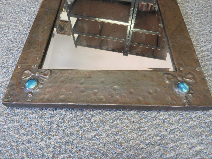 A 19TH CENTURY ART NOUVEAU PEWTER FRAMED MIRROR, with turquoise cabochons, frame 68 x 40 cm, mirror 44 x 29 cm