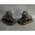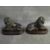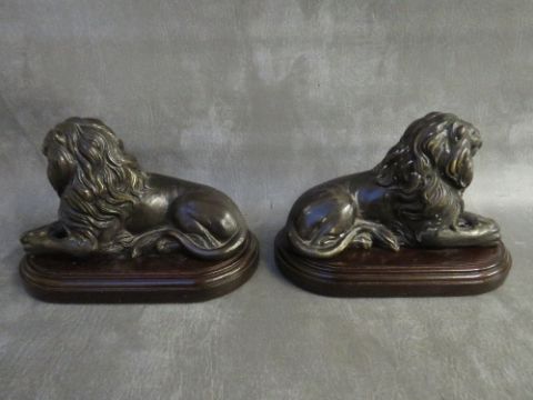 A PAIR OF EARLY 20TH CENTURY BRONZE LIONS, set on wooden bases, H 15 cm, base L 22 cm, W 12 cm