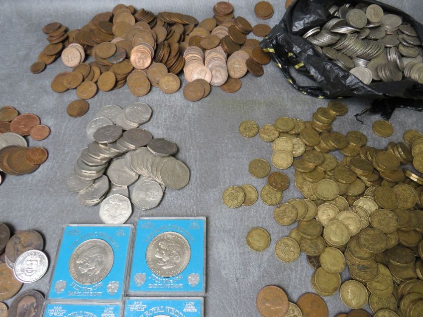 A COLLECTION OF LOOSE COINS, consisting of shillings, brass three pences, half pennies and obsolete 50 pences and a quantity of miscellaneous coins and replicas etc