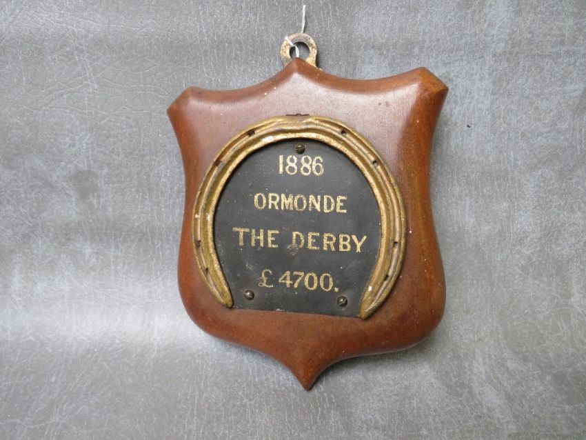 EQUESTRIAN / HORSE RACING INTEREST - A MOUNTED GILT HORSESHOE, relating to the racehorse 'Ormonde' winner of The Epsom Derby, having commemorative wording '1886 'ORMONDE' THE DERBY £4,700', overall H 22 cm (inc hanger)