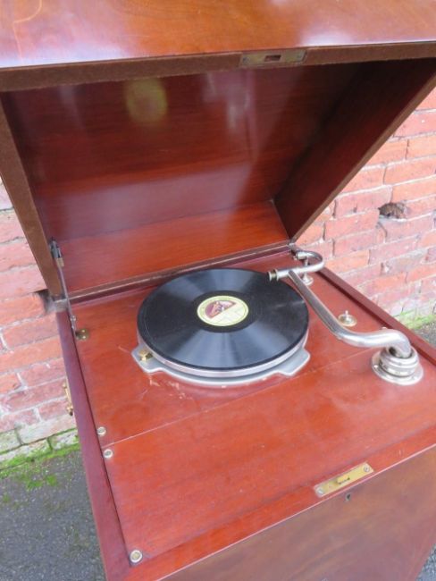 AN EXPERT SENIOR E.M. GINN GRAMAPHONE, floor standing in a mahogany case, with a large papier applique horn, horn Dia. 28 cm