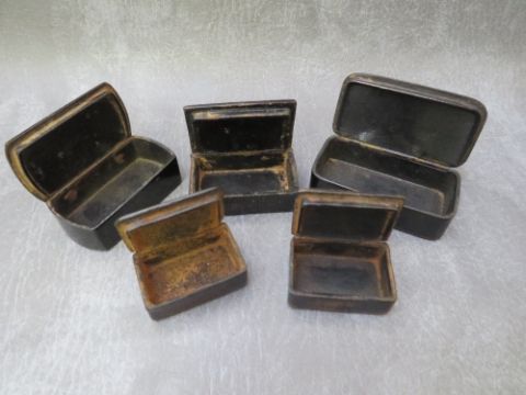 A COLLECTION OF FIVE VINTAGE PAPIER MACHE SNUFF BOXES, to include one with a portrait image to the lid in period clothing