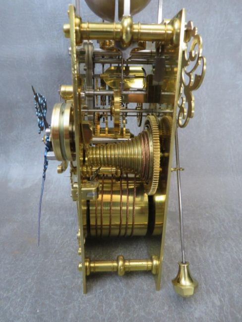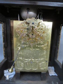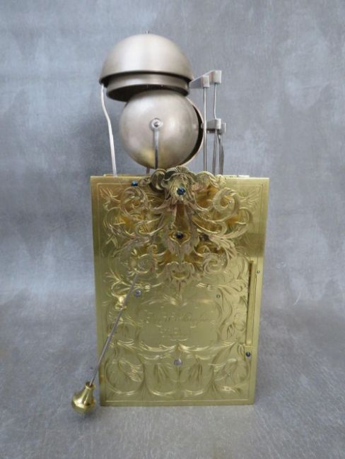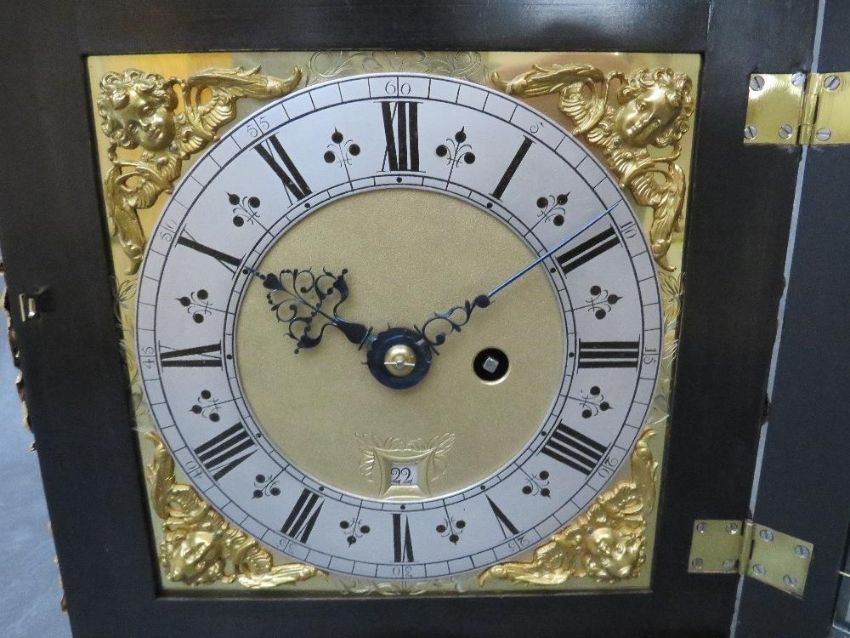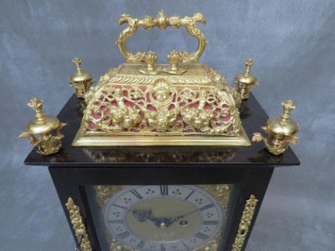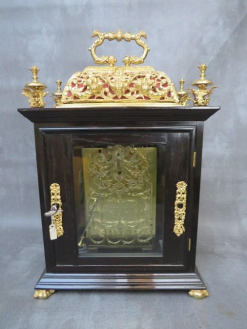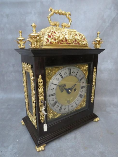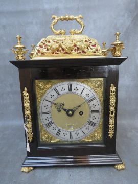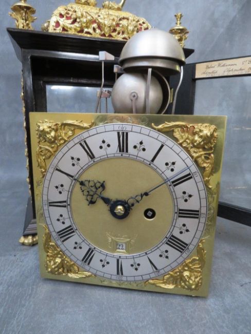 A VERY FINE LATE 17TH BASKET TOPPED BRACKET CLOCK BY ROBERT WILLIAMSON OF LONDON (1698-1714), the five pillar movement powered by a single train fusee movement and verge escapement, quarter striking on four silvered bells, the rear richly engraved with makers name and fretwork floral decoration and regulated by a short bob pendulum, the seven inch dial plate with gilded angelic spandrels, matted inner and silvered chapter ring, date aperture and blued filigree hands, the black ebonised case having richly decorated gilded panel and a pierced decorative basket top with zoomorphic carry handle, supported on lion paw feet, H 40 cm, W 27 cm, D 15 cm  Condition  Movement very clean. Going train ticks on winding. Striking train currently not working. Movement not fixed at present to saddle blocks. Ebonised case and gilded decorations appear to have been cleaned and restored – the four finials are not fixed