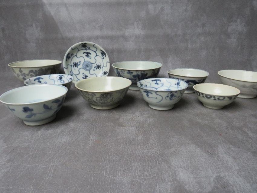 A COLLECTION OF NINE TEK SING CARGO BLUE AND WHITE BOWLS, together with a shallow saucer, all with Nagel Auctions stickers (10)