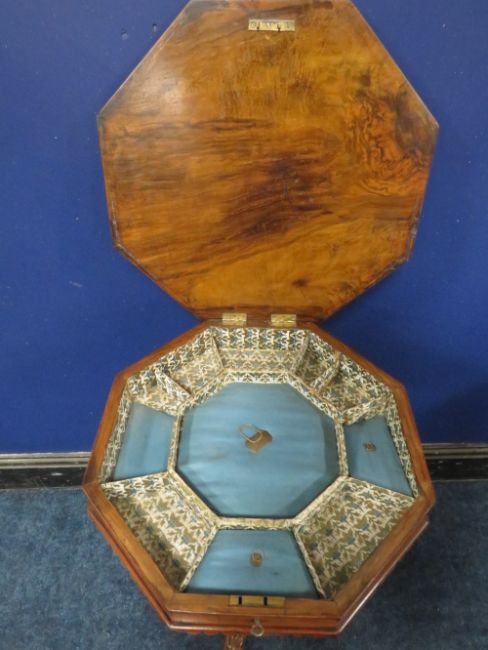 A VICTORIAN WALNUT TRUMPET SHAPED WORK TABLE, the hinged octagonal lid with satinwood inlaid detail, opening to a fitted interior, raised on a carved base, H 77 cm