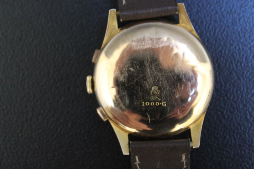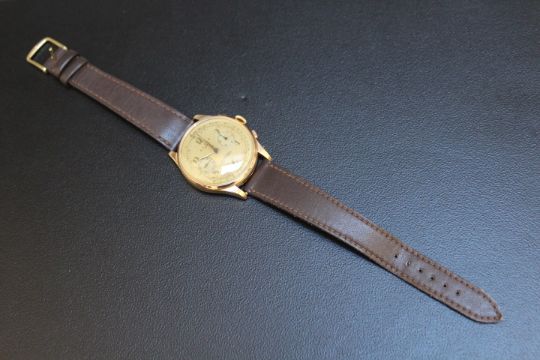 AN 18 CARAT GOLD ACTUA ANTIMAGNETIC 17 RUBIS CHRONOGRAPH WRIST WATCH, on new leather strap, Dia 4 cm