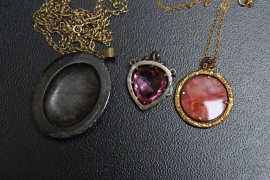 A COLLECTION OF VINTAGE PENDANTS, two bieing on chains stamped 9K, approx combined weight of chains 8.4g