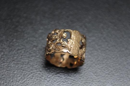 A HALLMARKED 9 CARAT GOLD PIERCED BAND, with floral design, approx weight 6.7g, ring size P 1/2