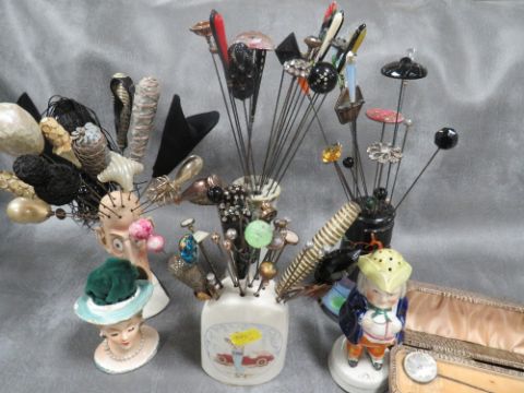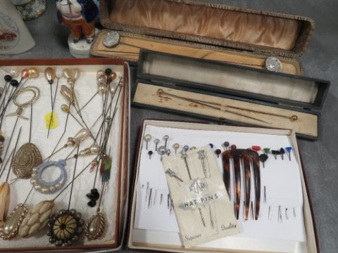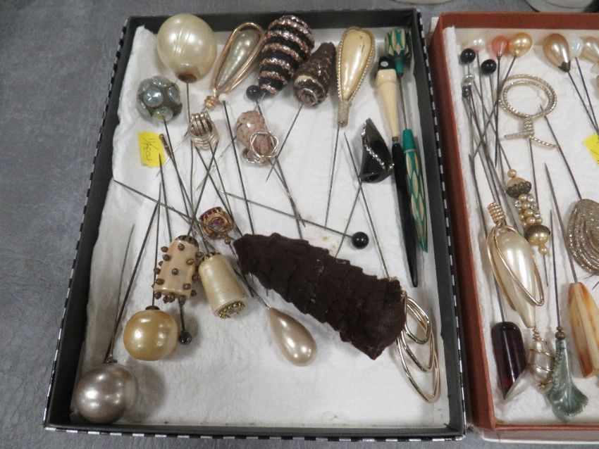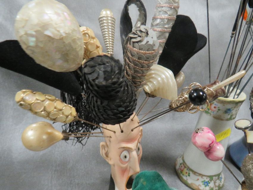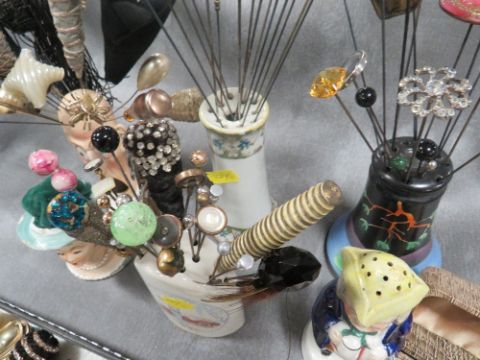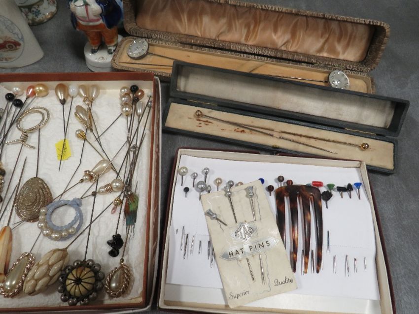 AN EXTENSIVE COLLECTION OF VINTAGE HATPINS ETC., various styles, sizes and periods, to include Art Deco and glass examples, felt examples etc., displayed in a selection of hat pin stands, together with two further hat pin stands and two boxed sets of hatpins (Approx. 150+)