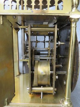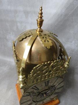 A LARGE 18TH CENTURY LANTERN CLOCK INSCRIBED JOHN MARTIN, LONDON, having a later 20th century Winterhalder Hofmeier ting tang movement fitted, three quarter striking on two bells, hourly strike on large bell, the brass case having a pierced decorative bell gallery, silvered dial and a now false alarm setting disc, clock has a repeat pull cord and with wooden base plate, H 38 cm, W 16 cm, D 16 cm
