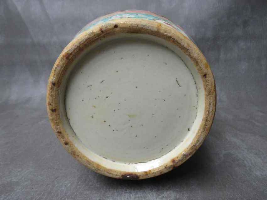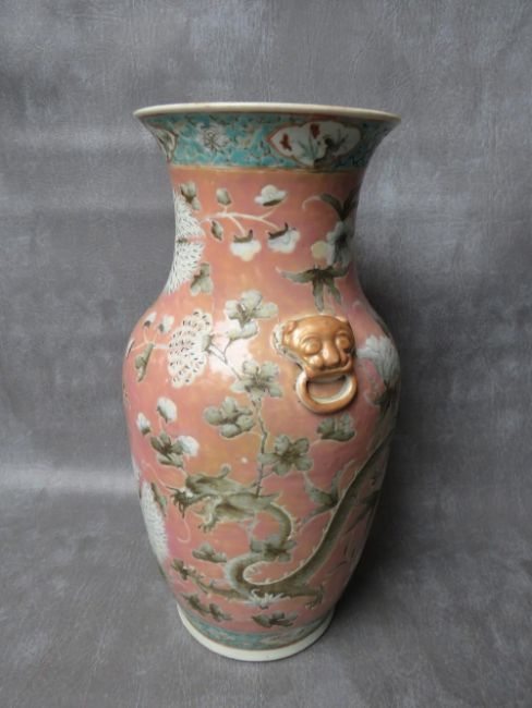 A CHINESE DAYAZHAM PORCELAIN VASE, circa 19th century, decorated with dragons amid peonies and chrysanthemum flowers on a salmon pink ground, H 35 cm, A/F Condition: The vase has a crack all around the base and has been re-stuck. There is also a chip to the rim