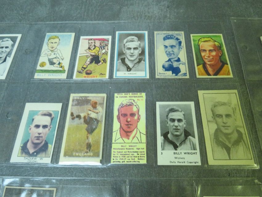 BILLY WRIGHT CIGARETTE AND TRADE CARDS 1947-2012, 8 pages, 85 small / medium size cards to include Subbuteo, D.C. Thomson, Donaldson (gold), B.D.V. Sports, Clifford's & Sweethule packet, rare 'M&M' frame, DC Thomson, Wilkinson, Barratt & Tonibell ice cream