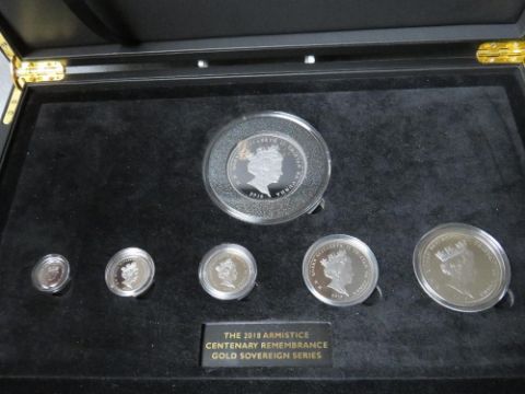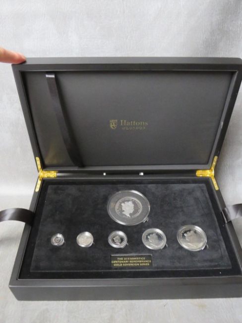 TRISTAN DA CUHNA 2018 ARMISTICE CENTENARY REMEMBRANCE GOLD SOVEREIGN SERIES SET, in fitted case, consisting of quarter sovereign (mintage 2,999), half sovereign (mintage 1918), sovereign (mintage 2018), double sovereign (mintage 149), and twenty pound (mintage 49). All depicting gallantry medals, the coins finished with black surface to highlight the medal designs.