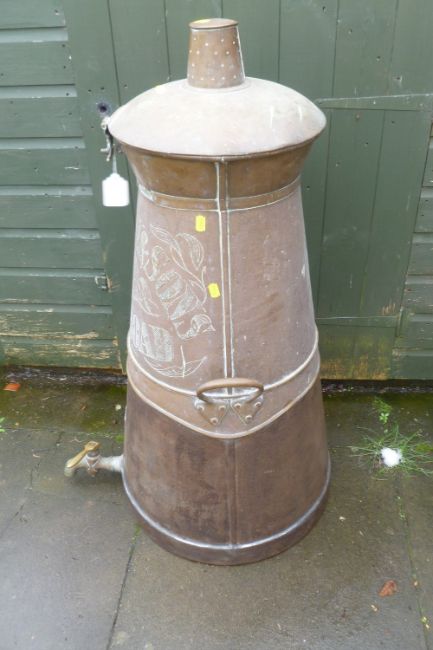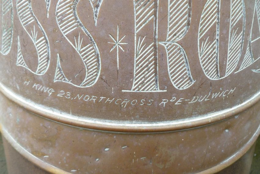 A VICTORIAN BRASS ADVERTISING 17 GALLON MILK CHURN. ENGRAVED TO FRONT- GODMAN & SONS, CROSS ROAD, makers mark H. King 23 Northcross Rd. E-Dulwich, H 99 cm