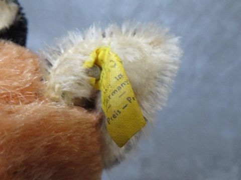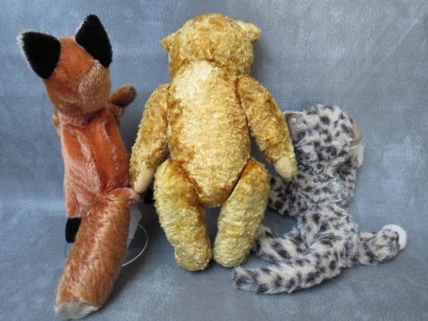 TWO VINTAGE STEIFF BEARS, to include an unusual fox hand puppet with original tag and button in ear, approx. L 30 cm, together with a vintage fully jointed golden mohair bear, H 37 cm (3)