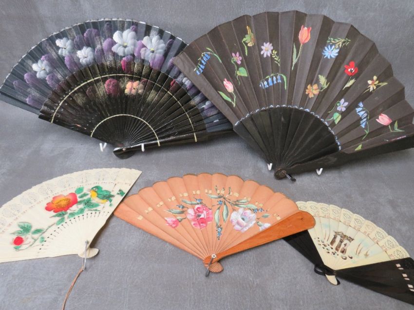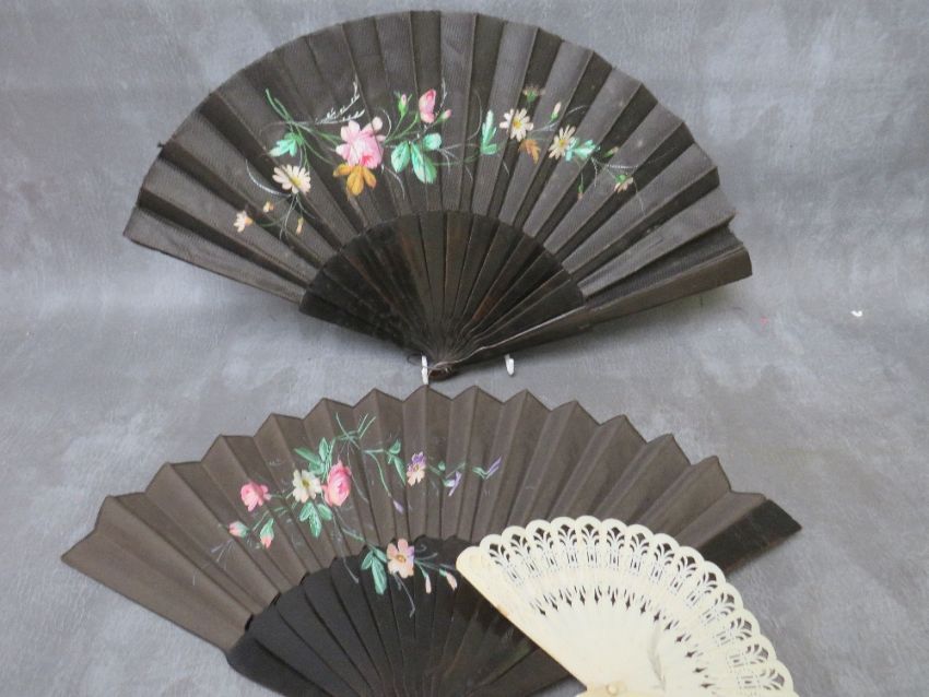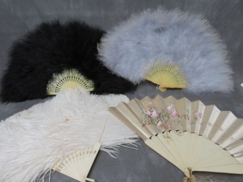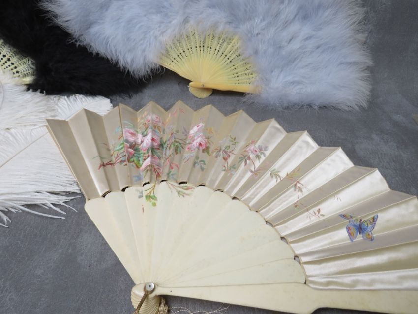 A COLLECTION OF VINTAGE HAND PAINTED AND FEATHER FANS, to include four ebonised hand painted examples, a satin and bone example with hand painted rambling roses and a butterfly, an unusual souvenir fan operated by a string pull at the top and bottom, mirror to revers, the feather fans comprising a cream ostrich feather example and blue and black marabou feather type examples (13)