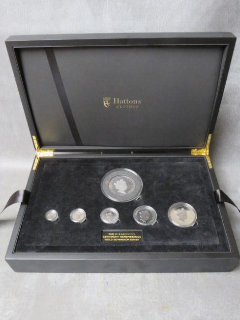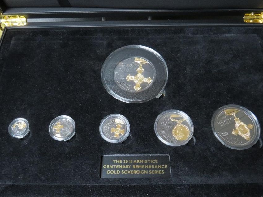 TRISTAN DA CUHNA 2018 ARMISTICE CENTENARY REMEMBRANCE GOLD SOVEREIGN SERIES SET, in fitted case, consisting of quarter sovereign (mintage 2,999), half sovereign (mintage 1918), sovereign (mintage 2018), double sovereign (mintage 149), and twenty pound (mintage 49). All depicting gallantry medals, the coins finished with black surface to highlight the medal designs.