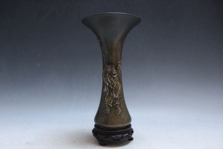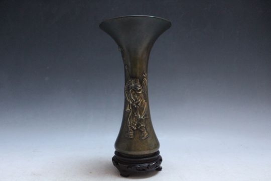 AN ORIENTAL BRONZE FLARED VASE, decorated with a figure blowing bubbles, character marks to the base, raised on a hardwood plinth, H 24.5 cm