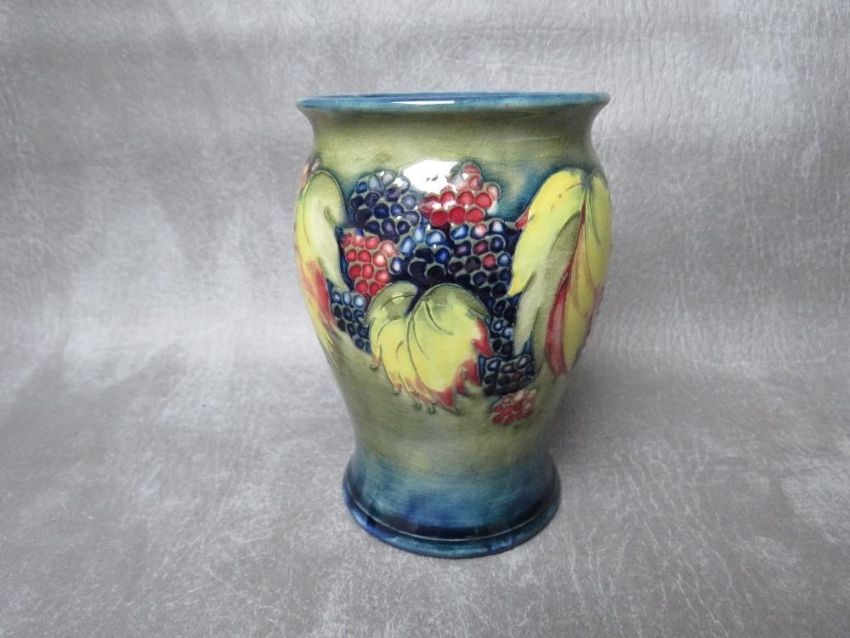 A MOORCROFT LEAF AND BERRY PATTERN BALUSTER VASE, impressed marks and sticker to the base, H 13 cm