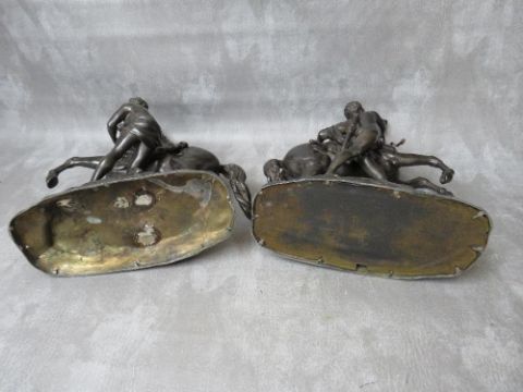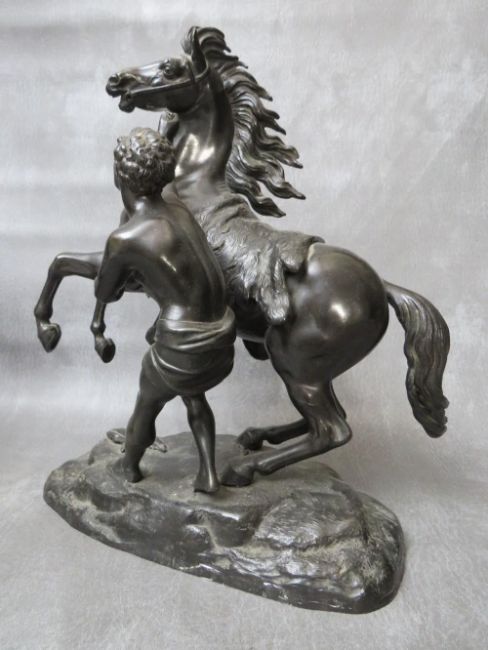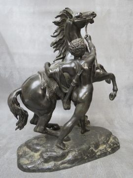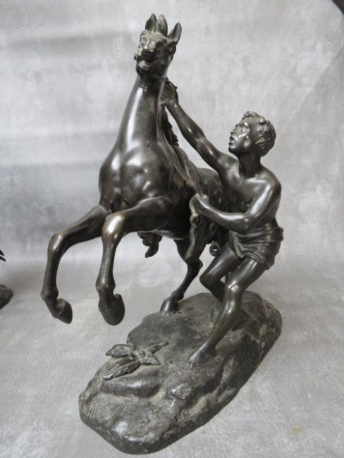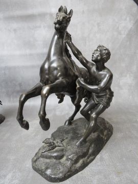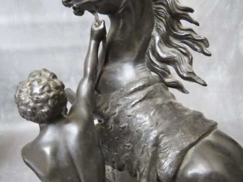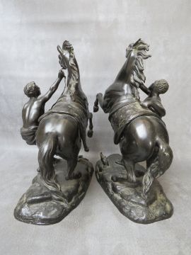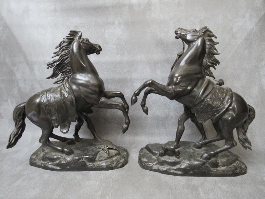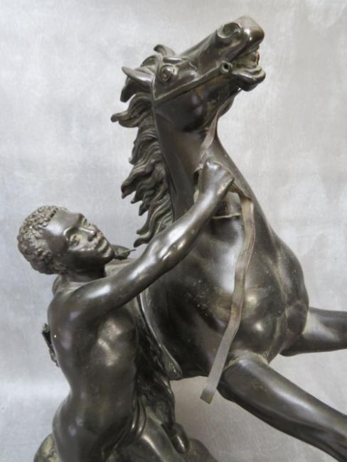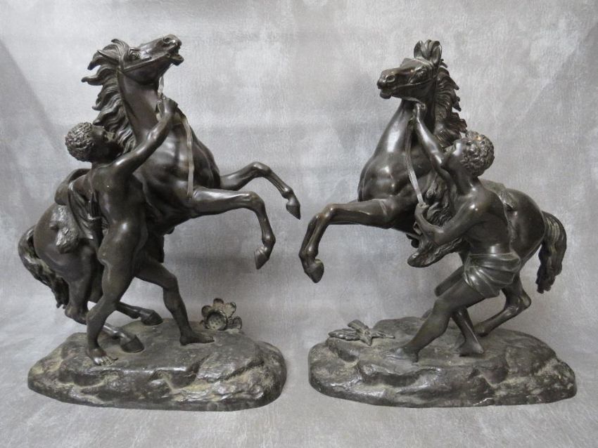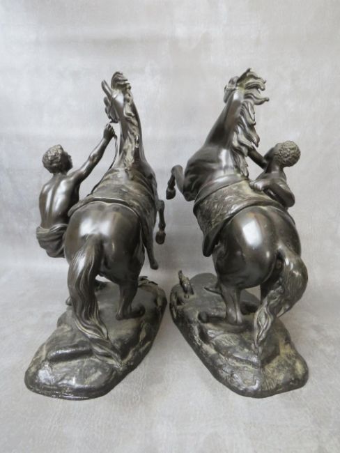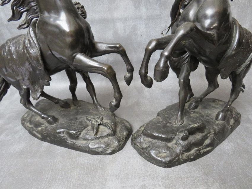 A PAIR OF FINELY CAST BRONZE MARLY HORSES WITH TRAINER, H 34 cm