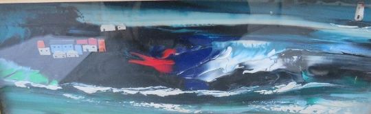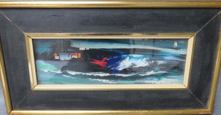 BERLY MAILE (b.1900), Impressionist stormy coastal seascape, with cottages and lighthouse, inscribed and dated 1968 on label verso, oil on vinyl, framed and glazed, 11 x 36 cm