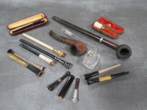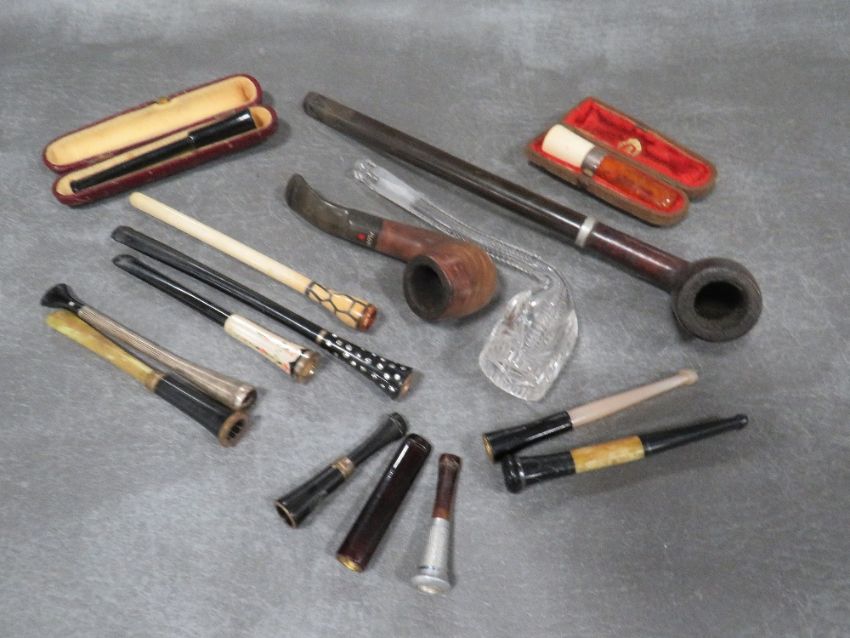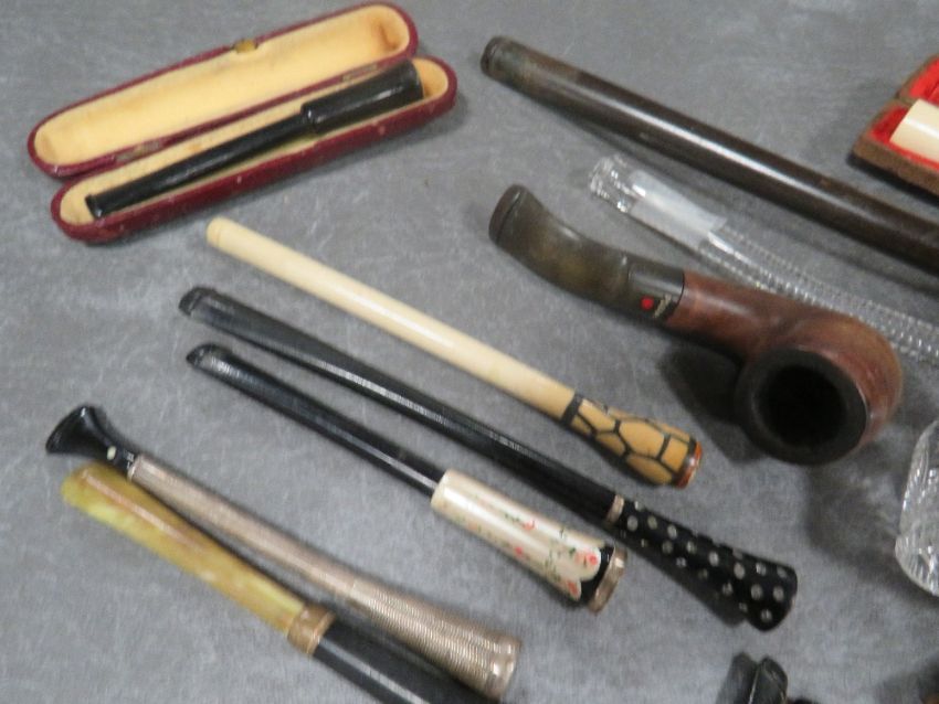 A COLLECTION OF VINTAGE CHEROOT HOLDERS, to include two cased examples, one being amber with a hallmarked silver collar, together with three vintage pipes (15)