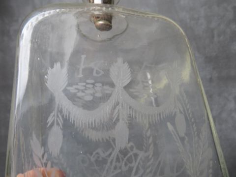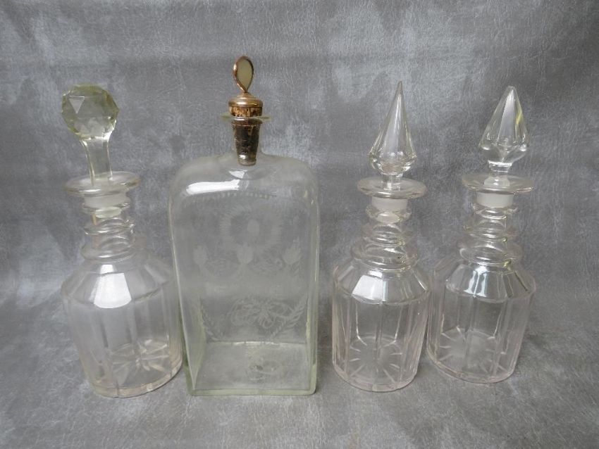 A 19TH CENTURY ETCHED GLASS RECTANGULAR SPIRIT FLASK, dated 1851, H 28.5 cm, together with three further 19th century decanters (4)