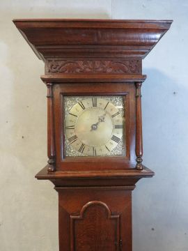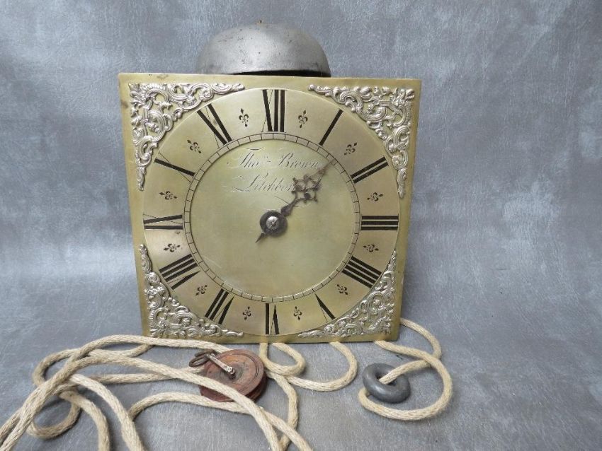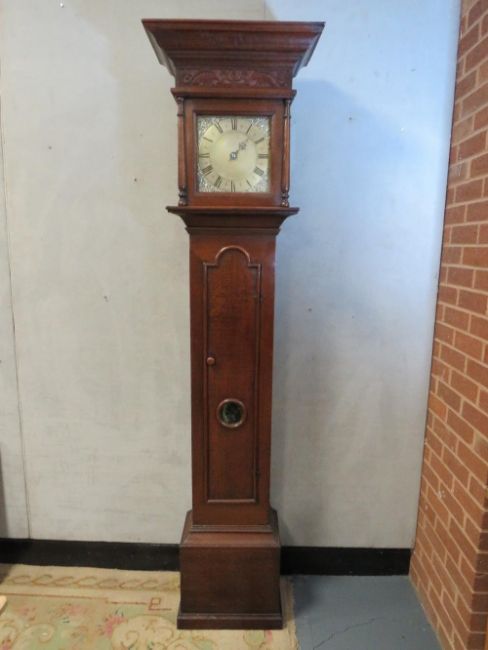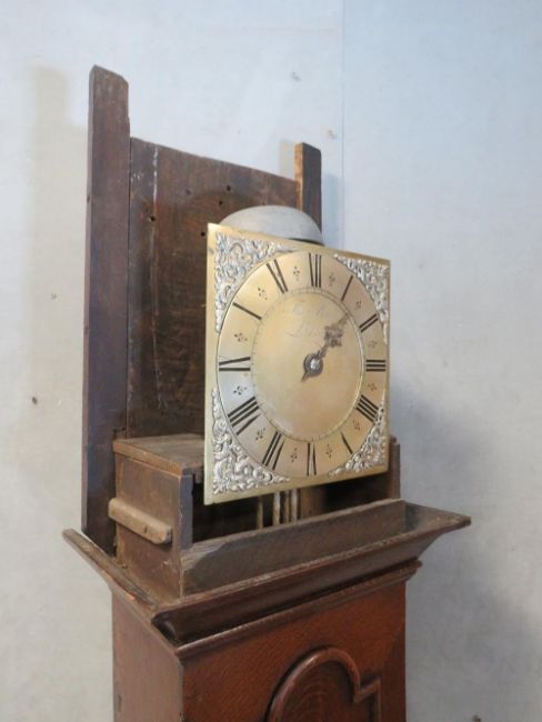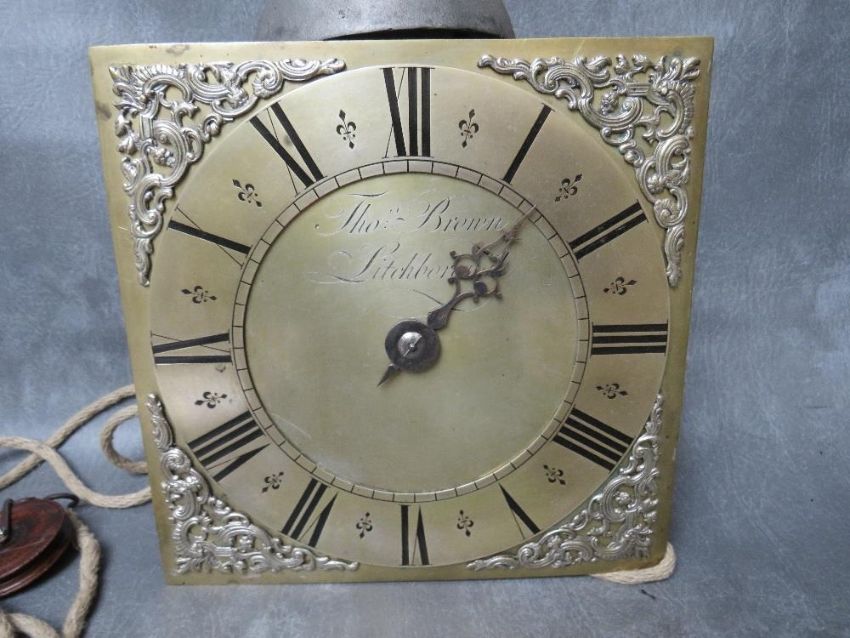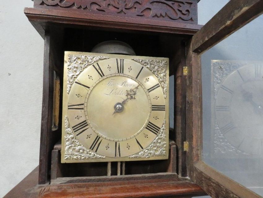 AN OAK CASED 30 HOUR LONG CASE CLOCK BY THOMAS BROWN OF LITCHBOROUGH, having a birdcage movement, hourly striking on a bronze bell, the silvered dial having a single hand pointer with quarter segment hour track, the oak case having a wide topped hood and bulls eye pendulum window to case, H 216 cm
