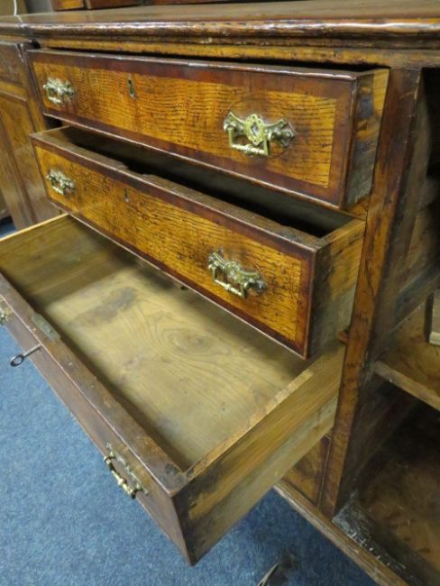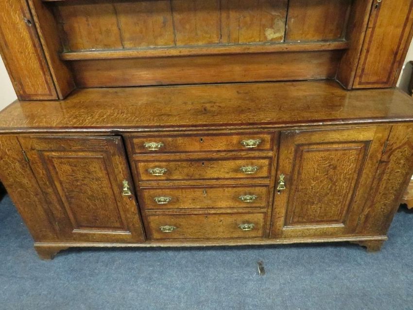 A GEORGIAN OAK CROSSBANDED WELSH DRESSER, the enclosed upper section with two crossbanded cupboards, above a lower section with four central graduated crossbanded drawers flanked by two cupboards, raised on shaped bracket feet, H 221 cm, W 194 cm, D 48 cm