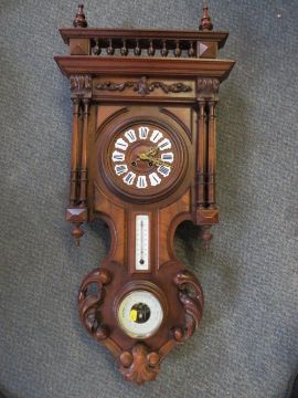 A LATE 19TH CENTURY FRENCH WALL CLOCK WITH BAROMETER AND SPIRIT THERMOMETER, in an elaborately carved oak case, with pendulum and key, H 95 cm