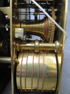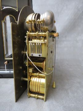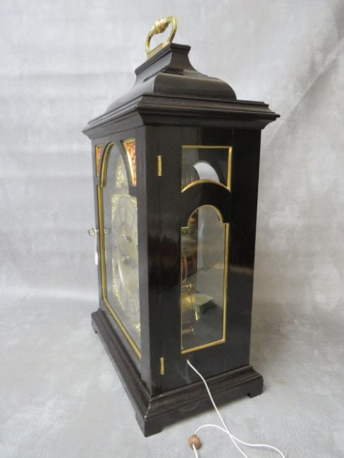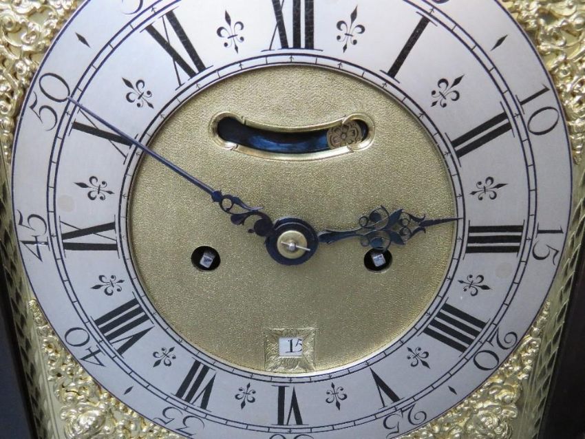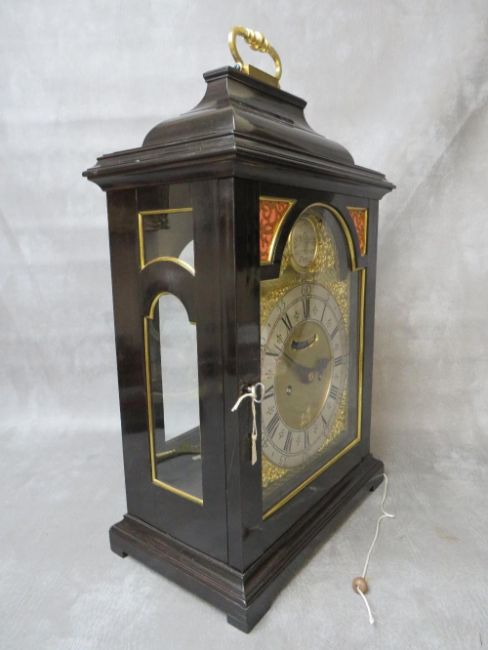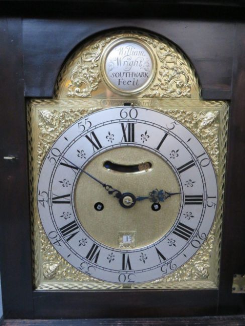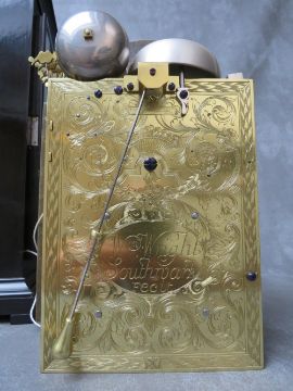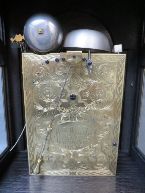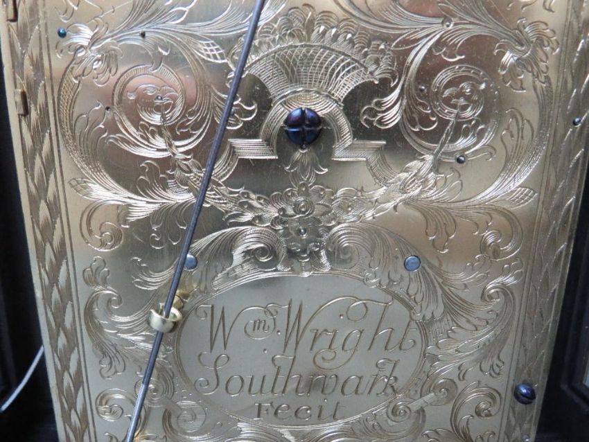 A LATE 18TH CENTURY EBONISED BRACKET CLOCK BY WILLIAM WRIGHT, SOUTHWARK, with twin fusee movement and verge escapement, quarterly strikes on six bells, hourly strike on large bell, the six pillar movement finely engraved to rear and with false pendulum, the brass arched top dial plate having silvered chapter ring with matted inner and a silvered date ring, silent / strike lever above 12 numeral and repeat pull strike cord, case of polished ebonised wood with side and rear glass panels and gilded brass frames, H 51 cm     Condition: Ebonsied cased and gilded decorations appear to have been cleaned and restored. Movement very clean. Gong train ticks on winding. Striking train strikes on the hourly bell. Quarter strike works on the repeat pull cord but not via the minute  hand