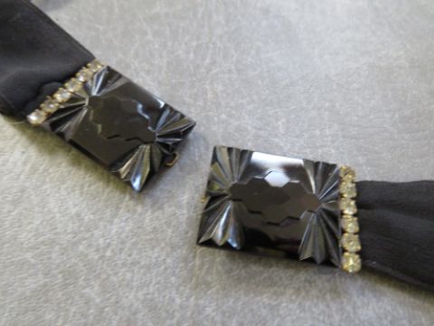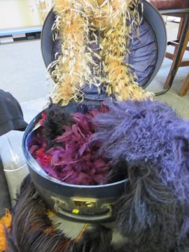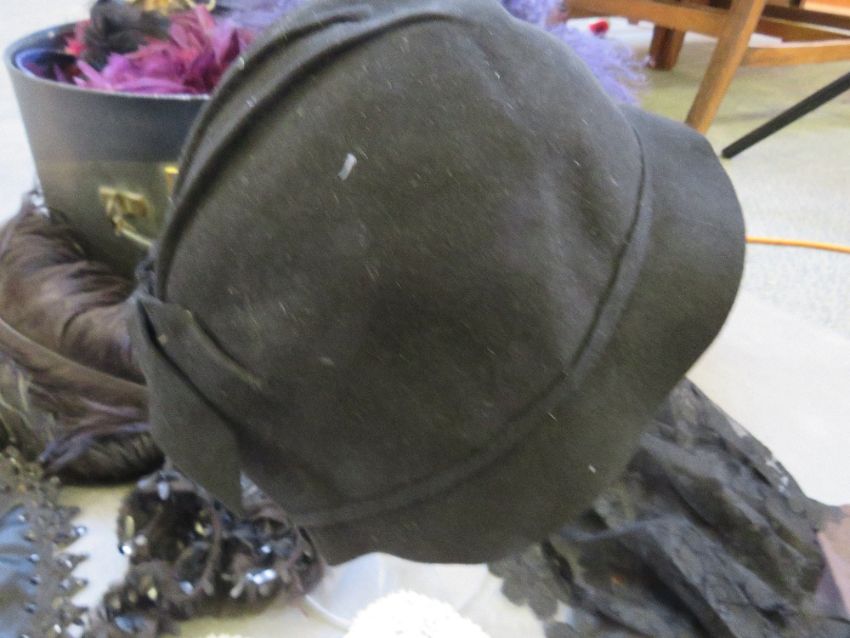 A VINTAGE HAT BOX AND CONTENTS, together with a selection of vintage children's clothing items and a jet embellished and embroidered apron, a Spanish style mantilla veil etc., the hat box contents include various loose feathers, a 1930 felt hat, feather collars, feather boas including a Passigatti example and an Art Deco belt with jet panel style buckle etc.