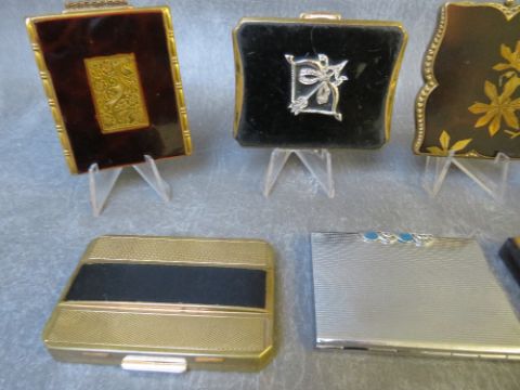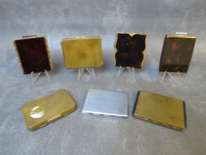 A COLLECTION OF SEVEN ART DECO AND LATER VINTAGE POWDER COMPACTS ETC., to include rectangular compact with Damascene panel to lid, a Kigu compact with gemset bow and arrow to lid, a Stratton compact and a Japanese 'Princess' compact (7)