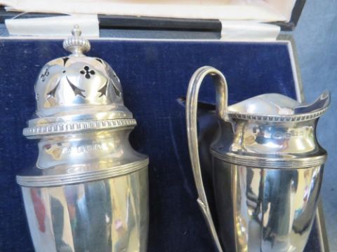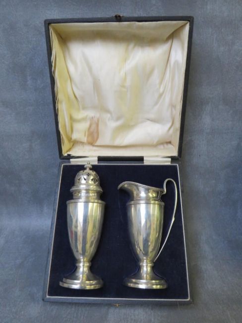 A CASED HALLMARKED SILVER STRAWBERRY SET, comprising a tall cream jug and sugar sifter, Birmingham 1925, in original fitted case, approx. weight 269 g