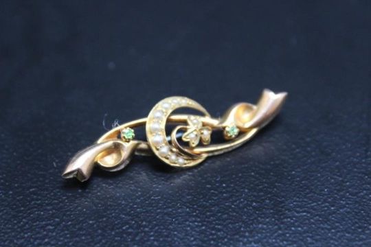 A CHESTER HALLMARKED 15 CARAT SEED PEARL AND PERIDOT BROOCH, approx weight 2.7g, W 4.25 cm