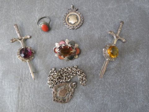 TWO HALLMARKED SILVER GEM SET KILT PINS IN THE FORM OF A SWORD, a marcasite ring marked 800, a hallmarked silver Celtic themed gemset and polished hardstone set brooch, silver chain and two hallmarked silver fob medals