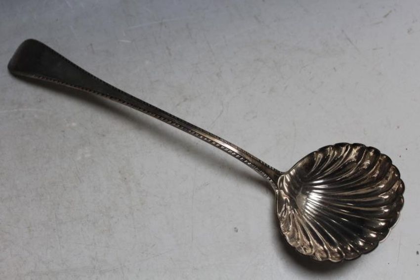 A HALLMARKED SILVER SCALLOPED BOWL LADLE - LONDON 1956, approx weigh 235g, L 33.25 cm