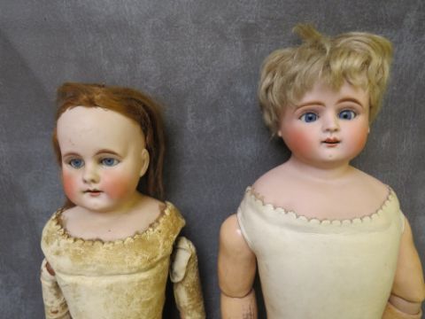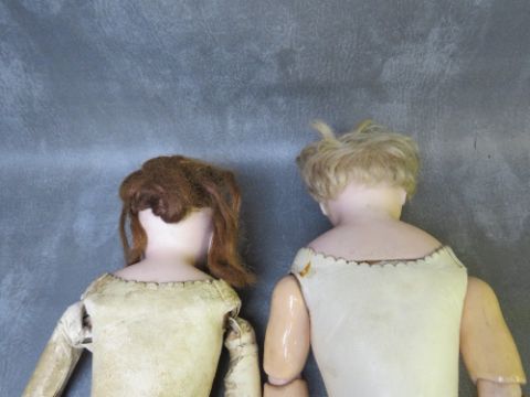 TWO LATE 18TH / 19TH CENTURY HIDE BODIED DOLLS, one marked 312 / 8, one in need of some restoration