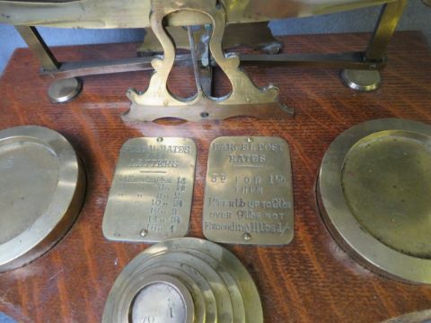 A VINTAGE SET OF POST OFFICE BRASS SCALES, on a wooden base, together with a set of brass weights, L 37 cm, H 20 cm