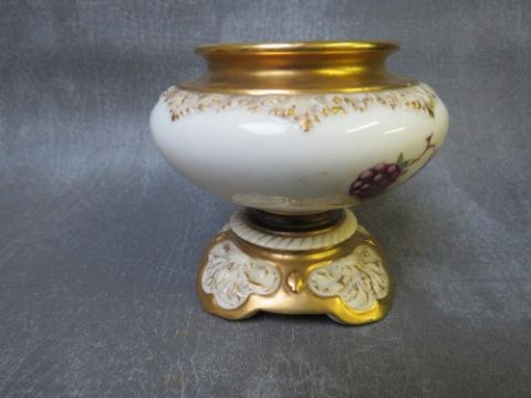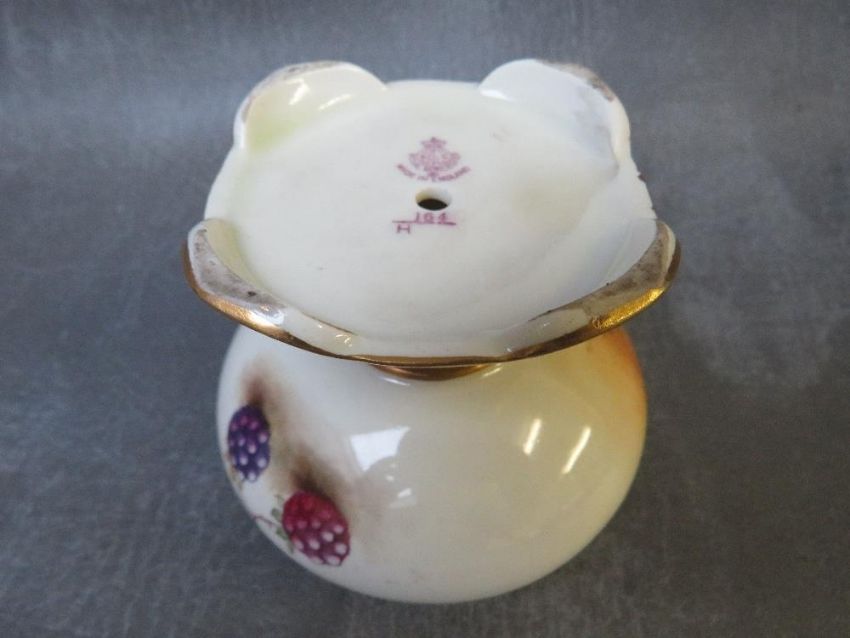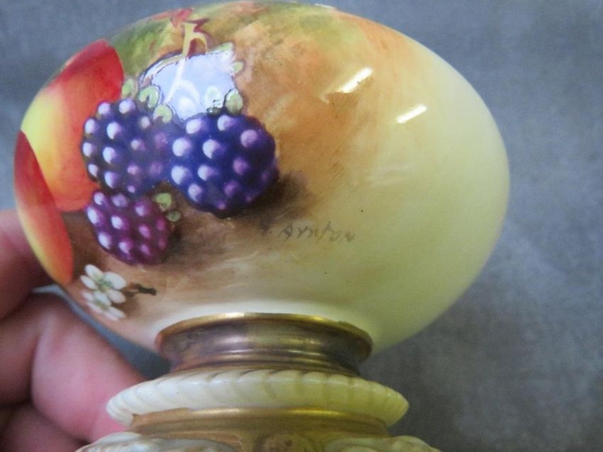 A ROYAL WORCESTER PAINTED FRUIT PEDESTAL URN SIGNED H AYRTON, gilded decoration throughout, puce factory mark to the base, H 8.2 cm Condition: No obvious damage or restoration.