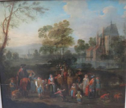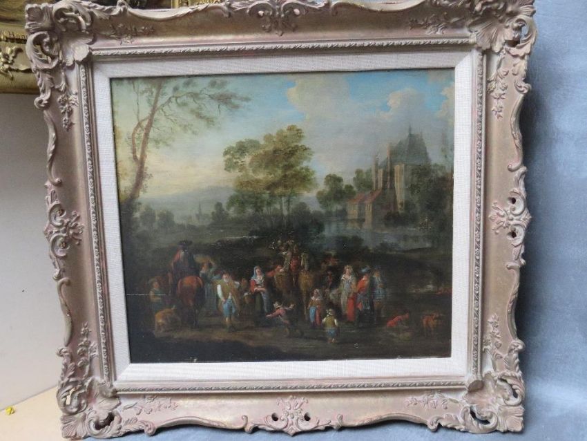 CONTINENTAL SCHOOL (XIX), a crowd in a river landscape, oil on panel, framed, 29 x 32 cm