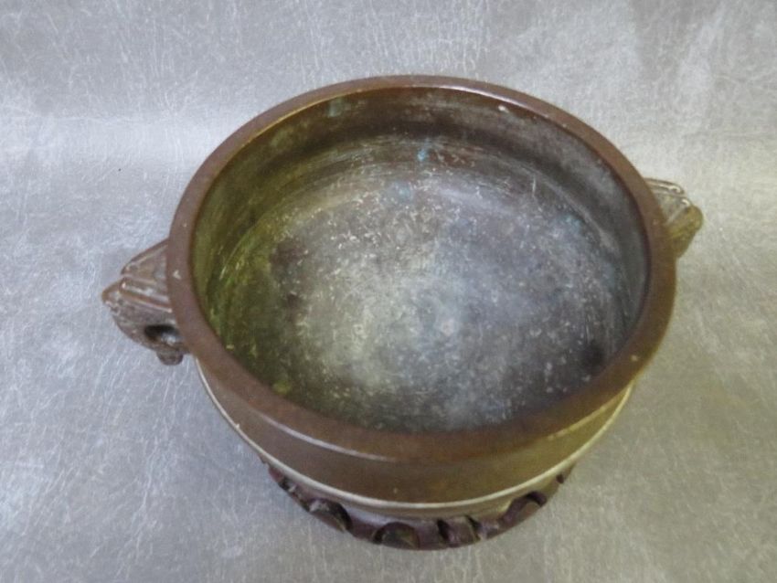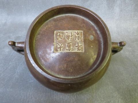 AN ORIENTAL TWIN HANDLED BRONZE CENSOR, with six character mark to the base, on a hardwood stand, H 6.5 cm, W 17 cm